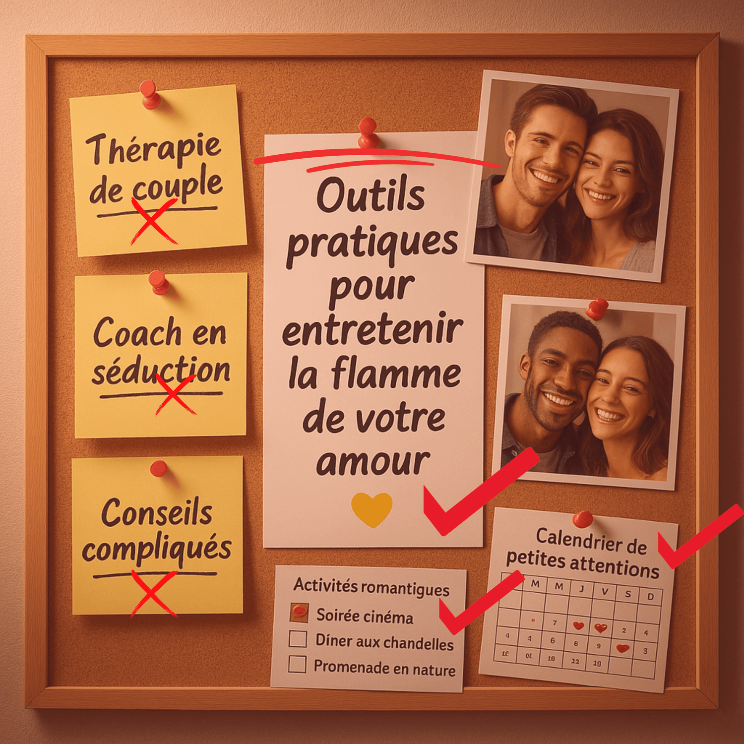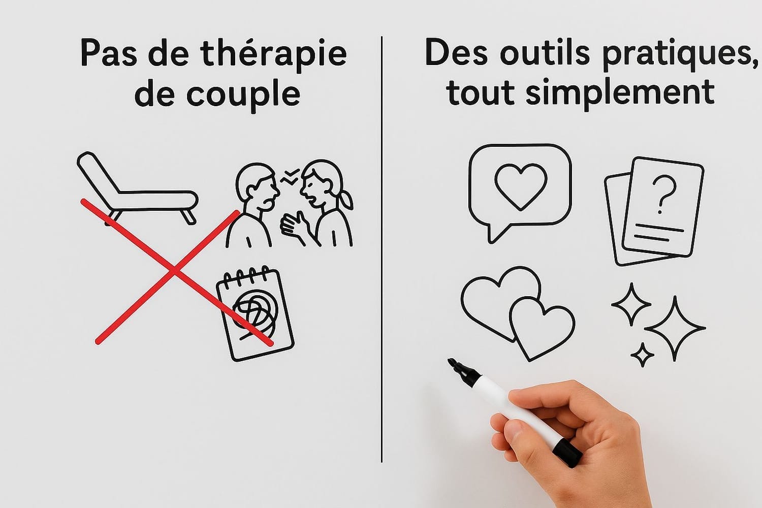 Notre approche est radicalement différente. Nous partons du principe que vous comprenez déjà l'importance de nourrir votre relation. Ce qui vous manque, ce ne sont pas les concepts, ce sont les outils.