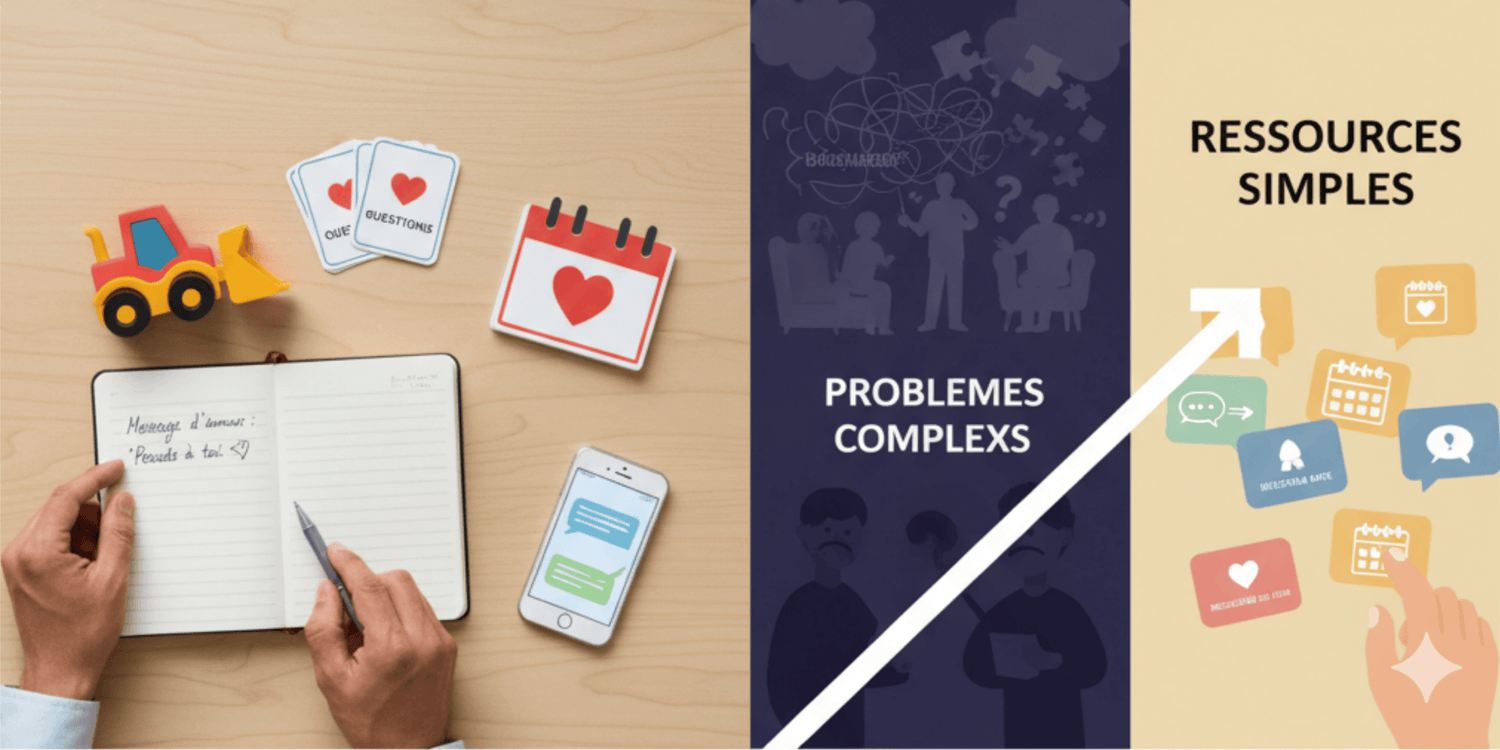 Pas de thérapie de couple à 150€ la séance. Pas de coaching sur plusieurs mois. Pas de livres de 400 pages remplis de concepts que vous n'appliquerez jamais. Juste des ressources tangibles, téléchargeables, utilisables dès aujourd'hui.
